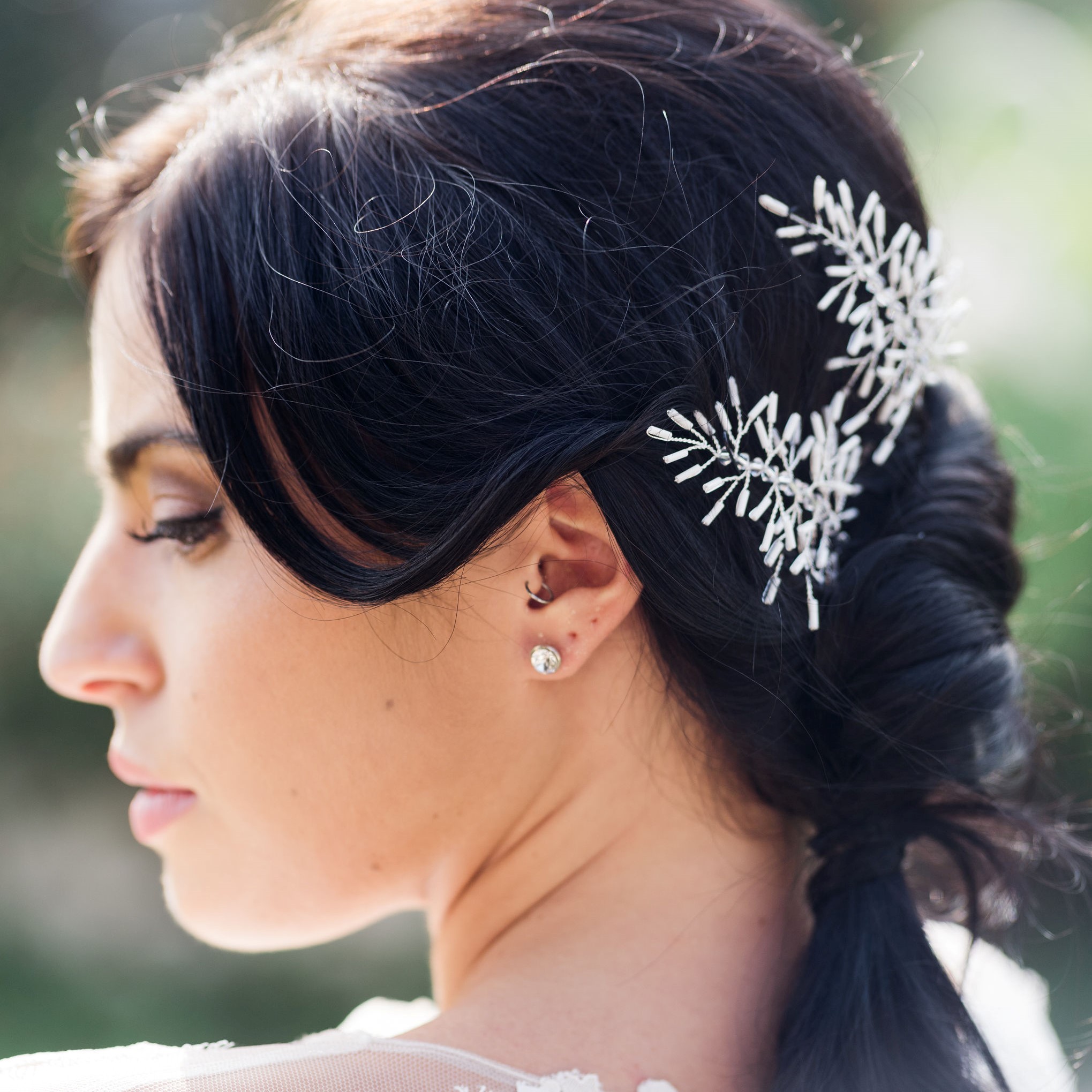 Questa collezione di accessori per capelli e orecchini da sposa si chiama FEUILLAGE, che in francese sta per “foglie, fogliame”.