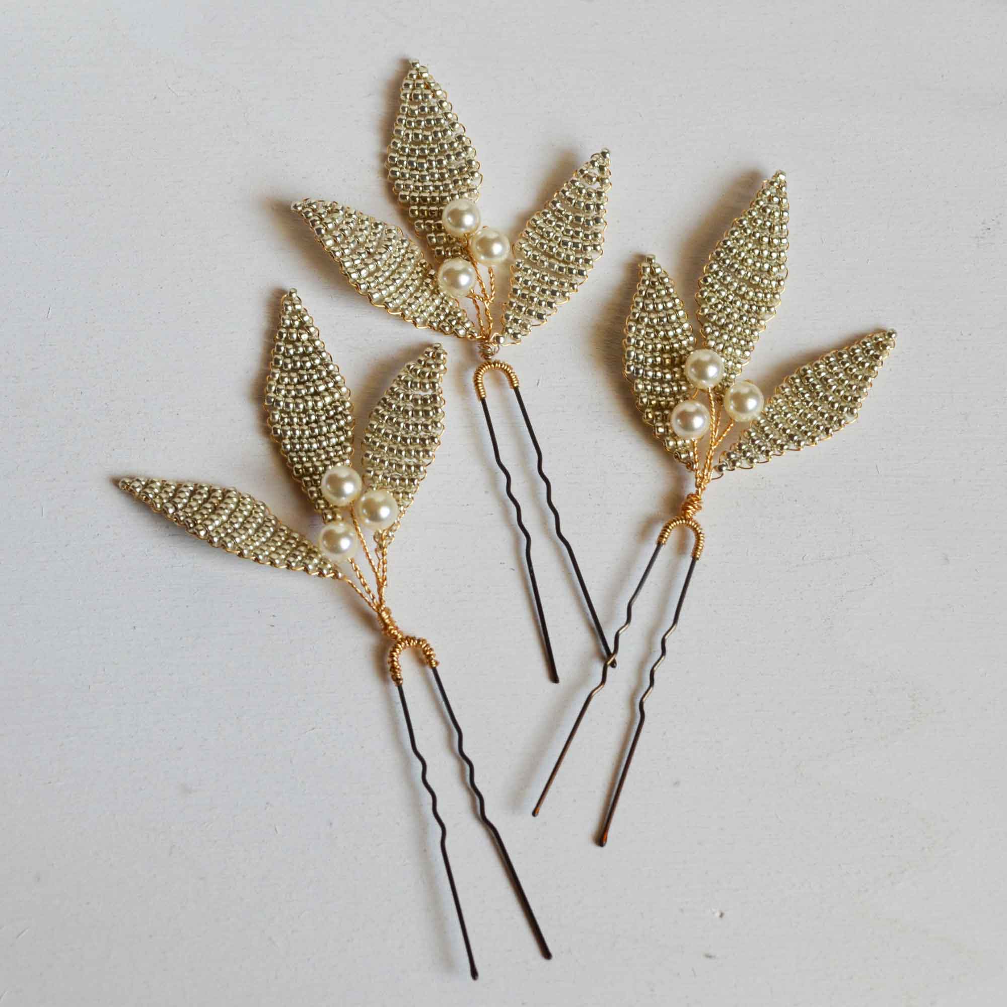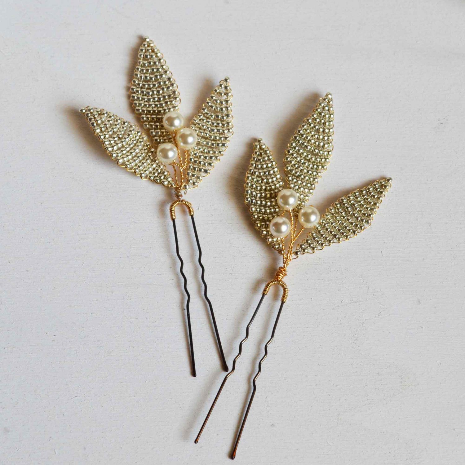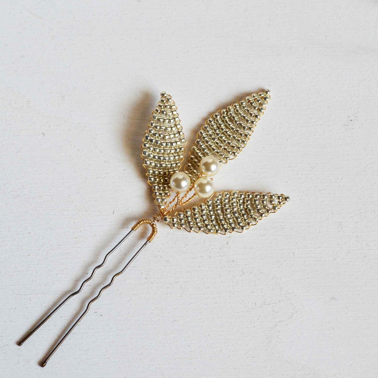 Forcina o spilla per capelli da sposa con foglie di ulivo. Le foglie sono realizzate intrecciando rocailles giapponesi color alluminio su filo dorato e perle Swarovski Cream da 6 mm. Altezza decoro 6 cm (forcina esclusa), larghezza 4 cm circa.
