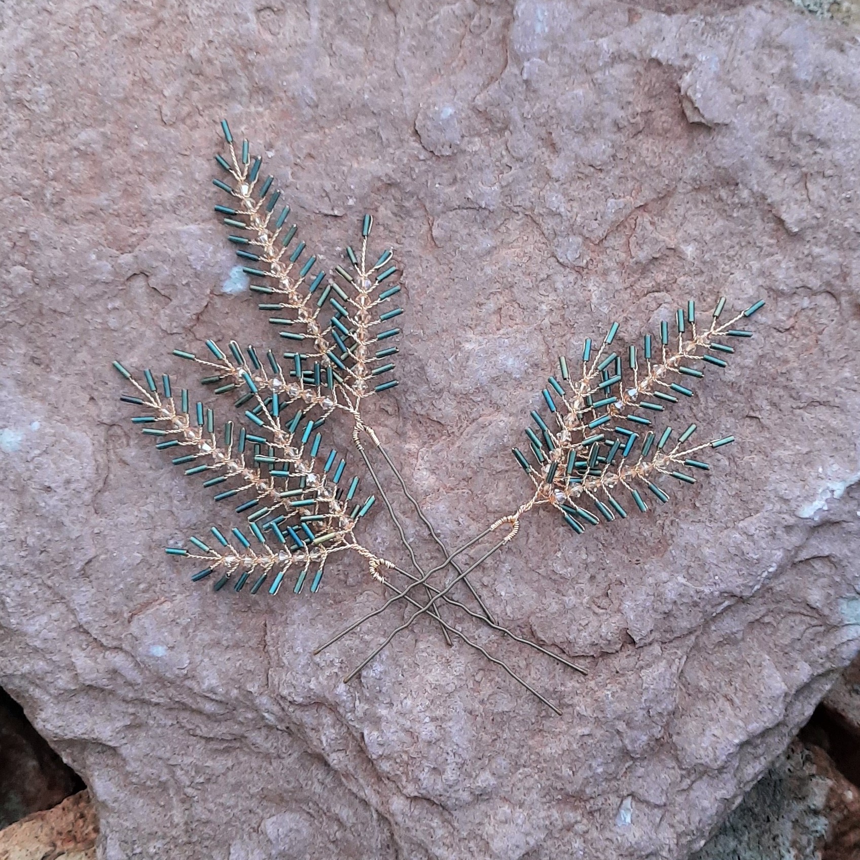Questa forcina a forma di foglia di felce o abete, delicatissima e molto luminosa, può adornare con grazia diverse acconciature, sia da sposa che per un’occasione particolare come il Natale o Capodanno. L’abbinamento verde e oro e il tema bucolico rendono queste forcine particolarmente adatte alla stagione autunnale e invernale. Si abbinano felicemente ad abiti da sposa boho chic, ricchi di romantico tulle e pizzi. Scegli la quantità desiderata, da 1 a 3 forcine.