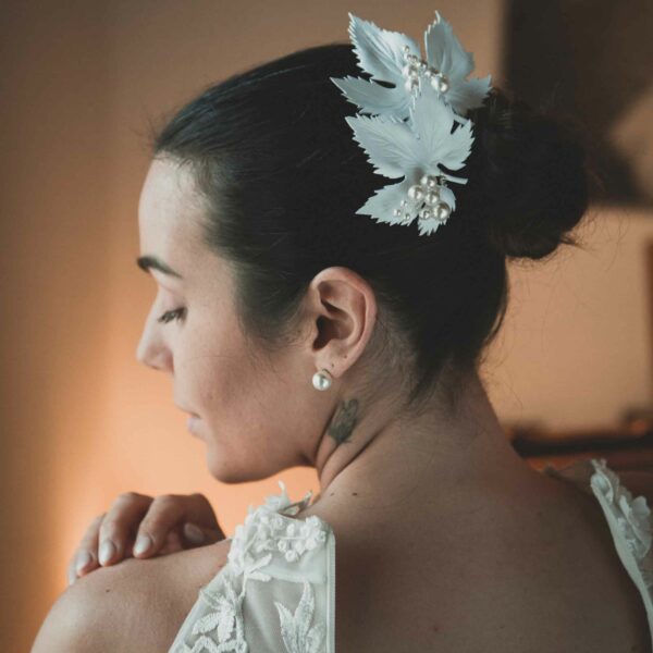 Forcina decorata con una foglia di vite grande in pelle naturale bianca con perle Swarovski White (bianche) di varie misure. Dimensione della foglia 9×9,5 cm circa (forcina esclusa). Il retro della foglia è rivestito in tessuto satin metallizzato argento. Le foglie di vite della collezione FEUILLAGE sono interamente realizzate a mano con tecniche tradizionali di modisteria. Per questo motivo ogni foglia si può considerare un pezzo unico.