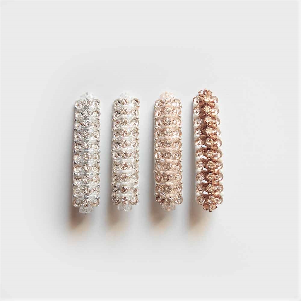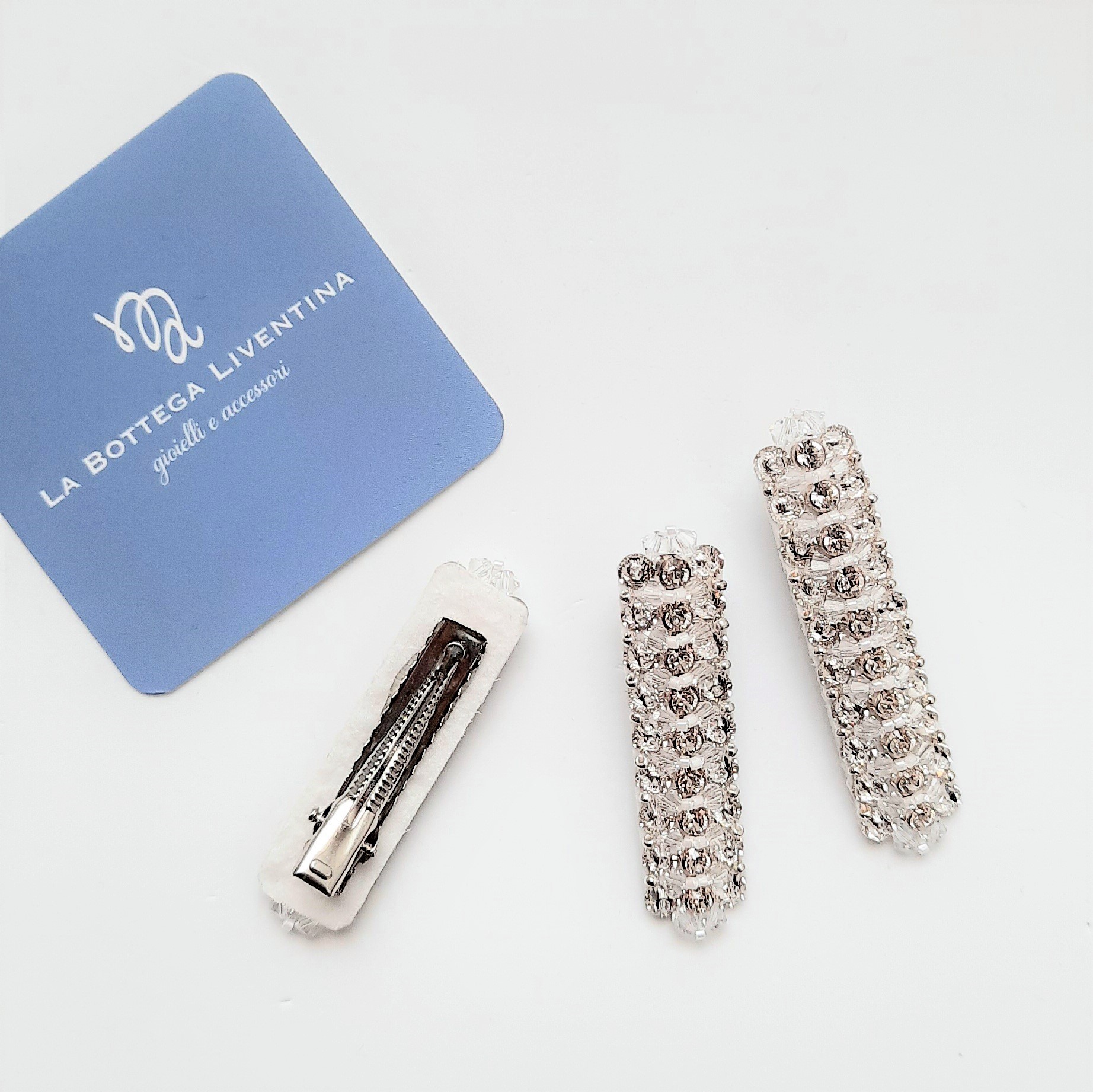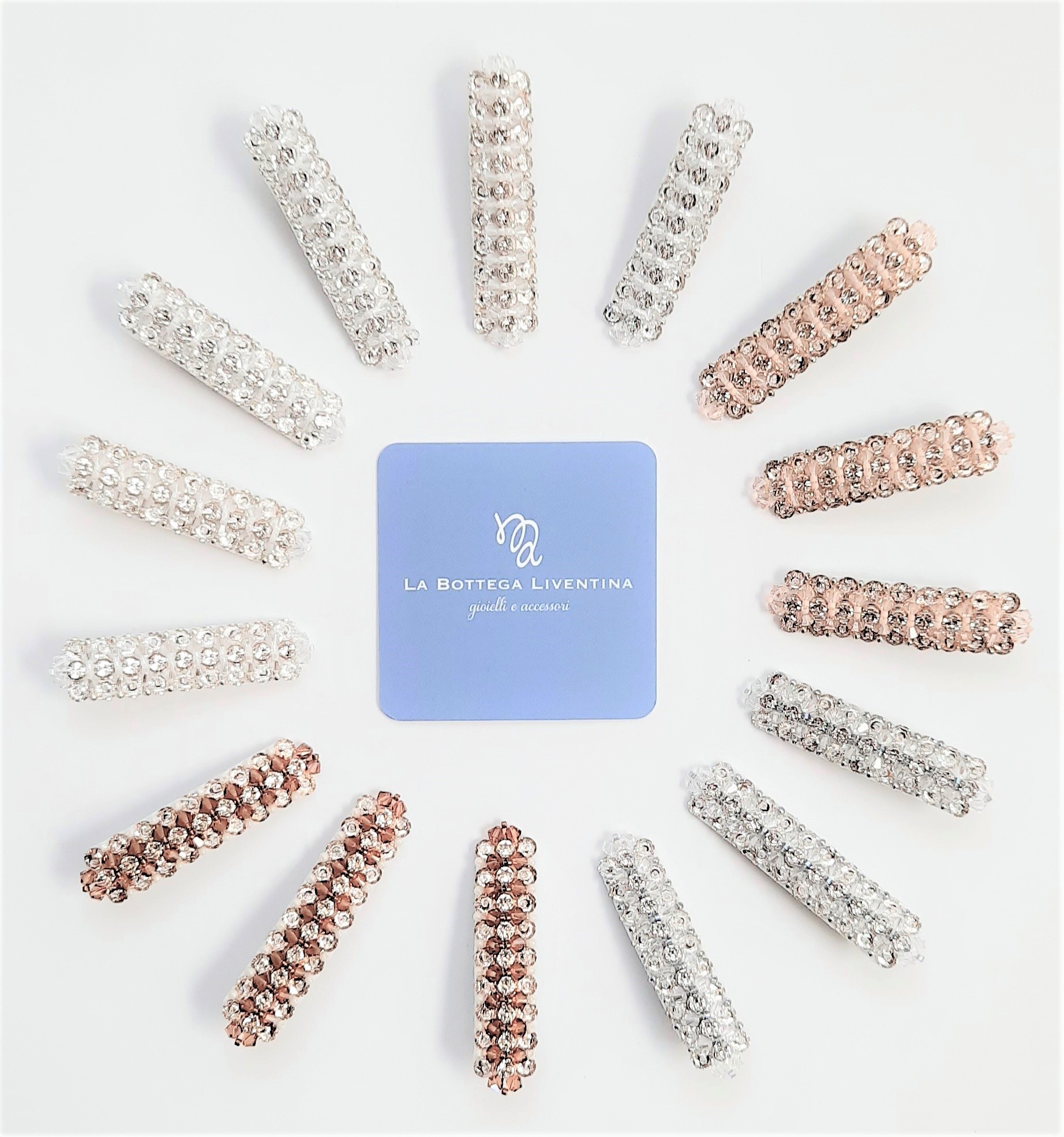 Molletta con decorazione ricamata a mano di cristalli Swarovski di diversi tagli e dimensioni, e perline giapponesi.