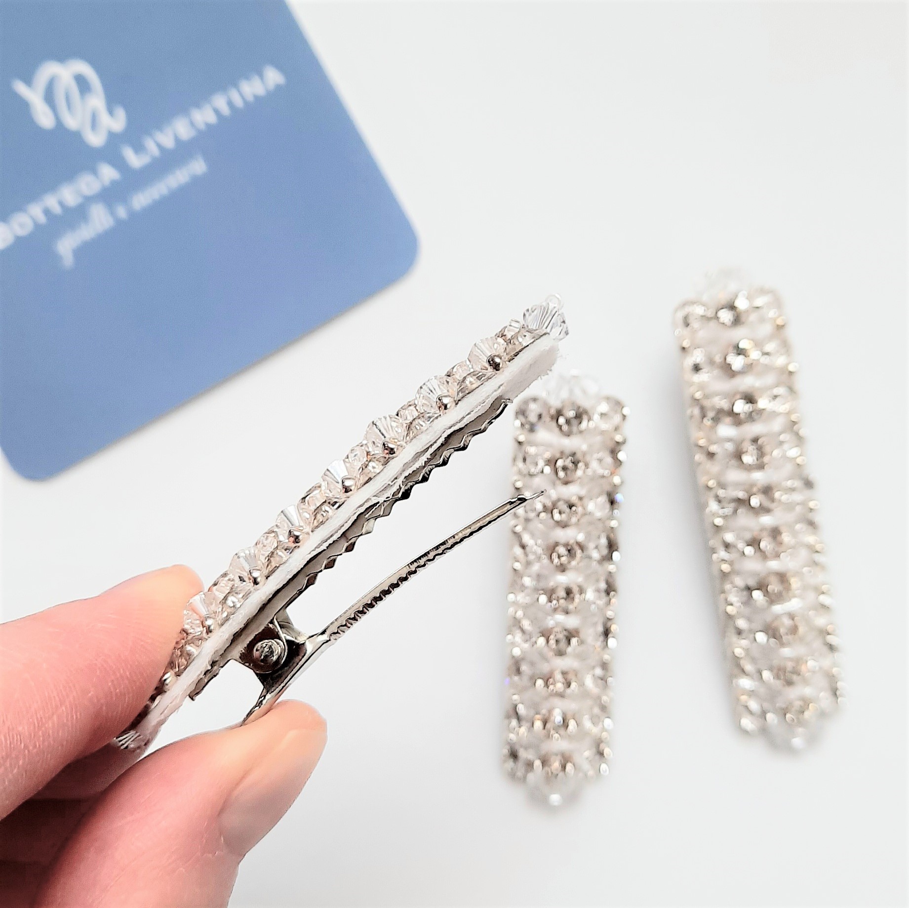 Scegli il colore più adatto a te e al tuo stile! Un’unica molletta ricamata con cristalli e perline decorerà la tua acconciatura in modo semplice ma sofisticato. Due o più mollette ti permetteranno di impreziosire l’acconciatura con una decorazione speciale, pensata solo per te. La base della molletta è solida e di alta qualità, si aggrappa facilmente a qualsiasi tipo di capello. Ideale anche per una sposa/damigella dai capelli corti. Queste forcine-gioiello si abbinano perfettamente ad abiti bon ton e a tessuti strutturati come il mikado. Puoi scegliere la quantità da acquistare, da 1 a 3 mollette.