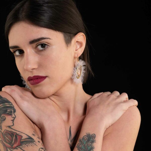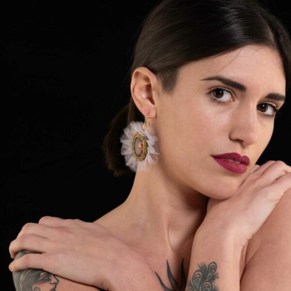 Orecchini con monachella aperta in argento 925 italiano placcato oro 21kt con cammei in vetro, stampa su carta, ricamati a mano con rocailles e delicas in vetro 11/0 e 15/0. Ogni cammeo è circondato da quattro strati di morbido tulle mano seta color rosa chiaro. Il retro del pendente è rivestito in ecopelle scamosciata. Dimensione pendente circa 6×5 cm. Interamente ricamati e cuciti a mano in Italia. Disponibili con altra tipologia di gancio — monachella chiusa, orecchino a chiodo — solo su richiesta.