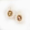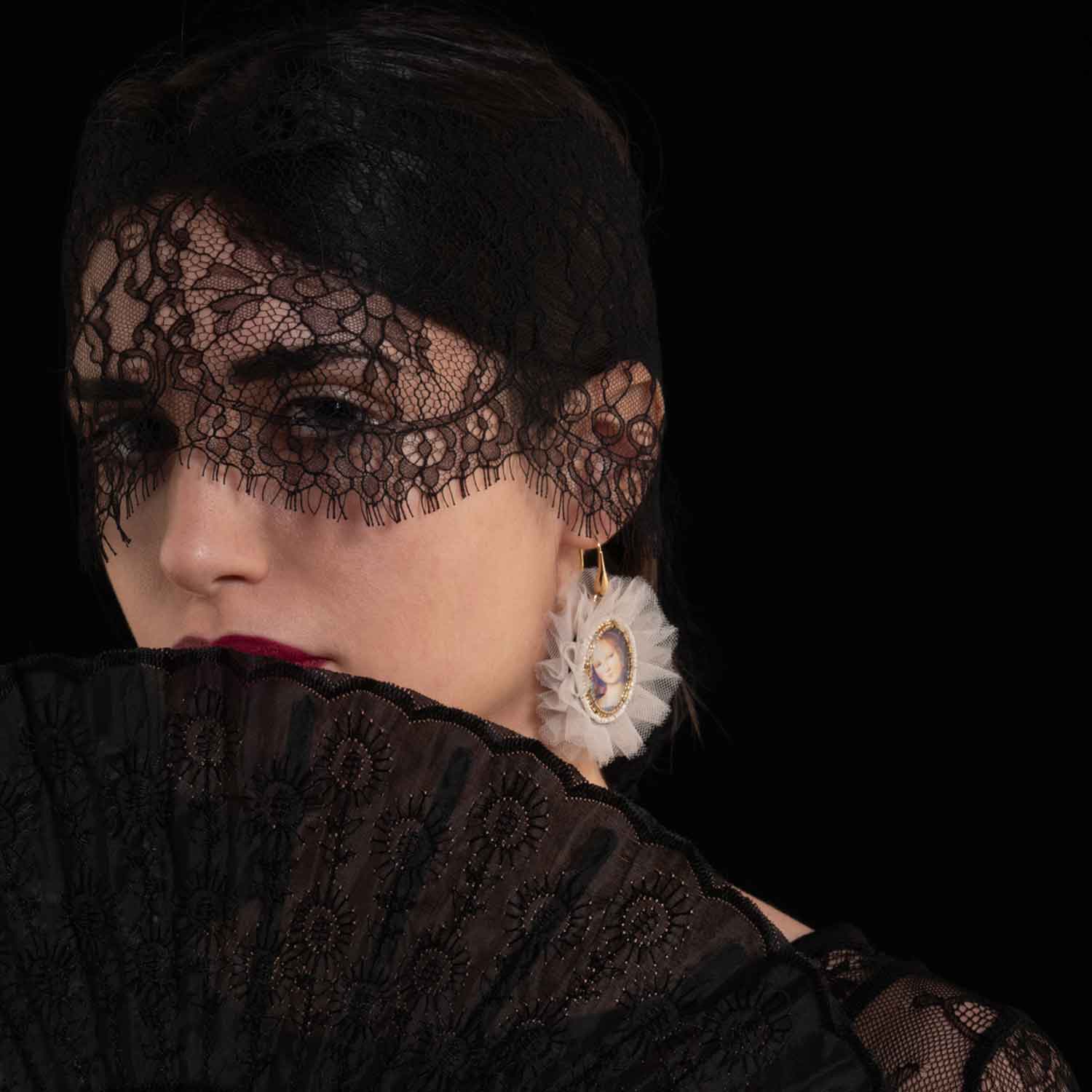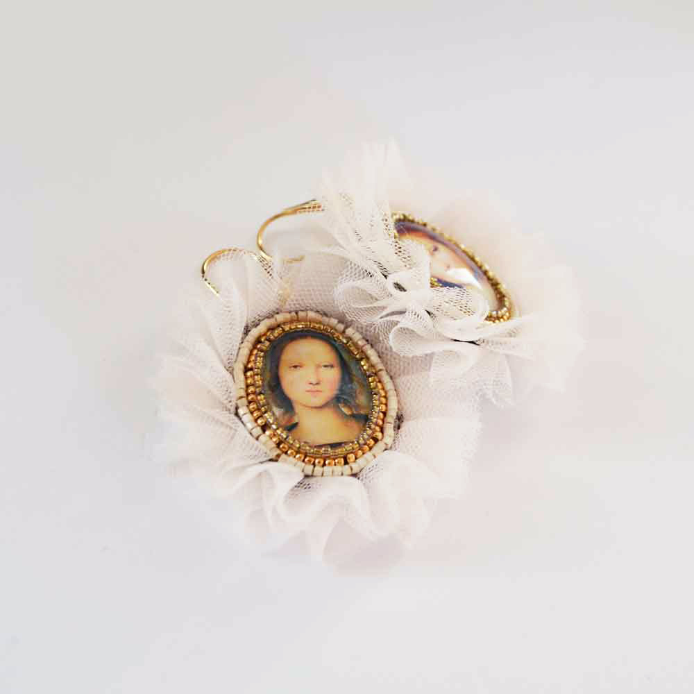 Orecchini con monachella aperta in argento 925 italiano placcato oro 21kt con cammei in vetro, stampa su carta, ricamati con rocailles e delicas in vetro giapponese 11/0 e 15/0. I cammei sono circondati da una corona di quattro strati di morbido tulle mano seta color avorio. Il retro del pendente è rivestito in ecopelle scamosciata. Dimensione pendente circa 6×5 cm. Interamente realizzati a mano in Italia. Disponibili con altra tipologia di gancio — monachelle chiuse, orecchini a chiodo — solo su richiesta.