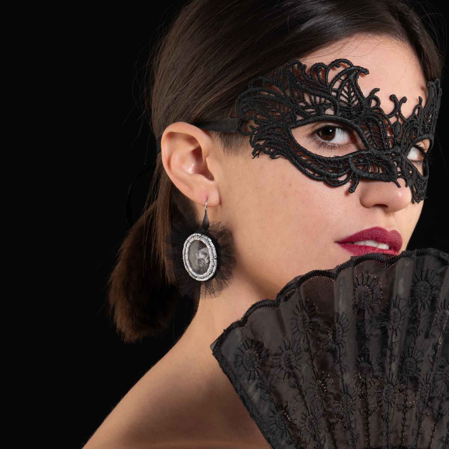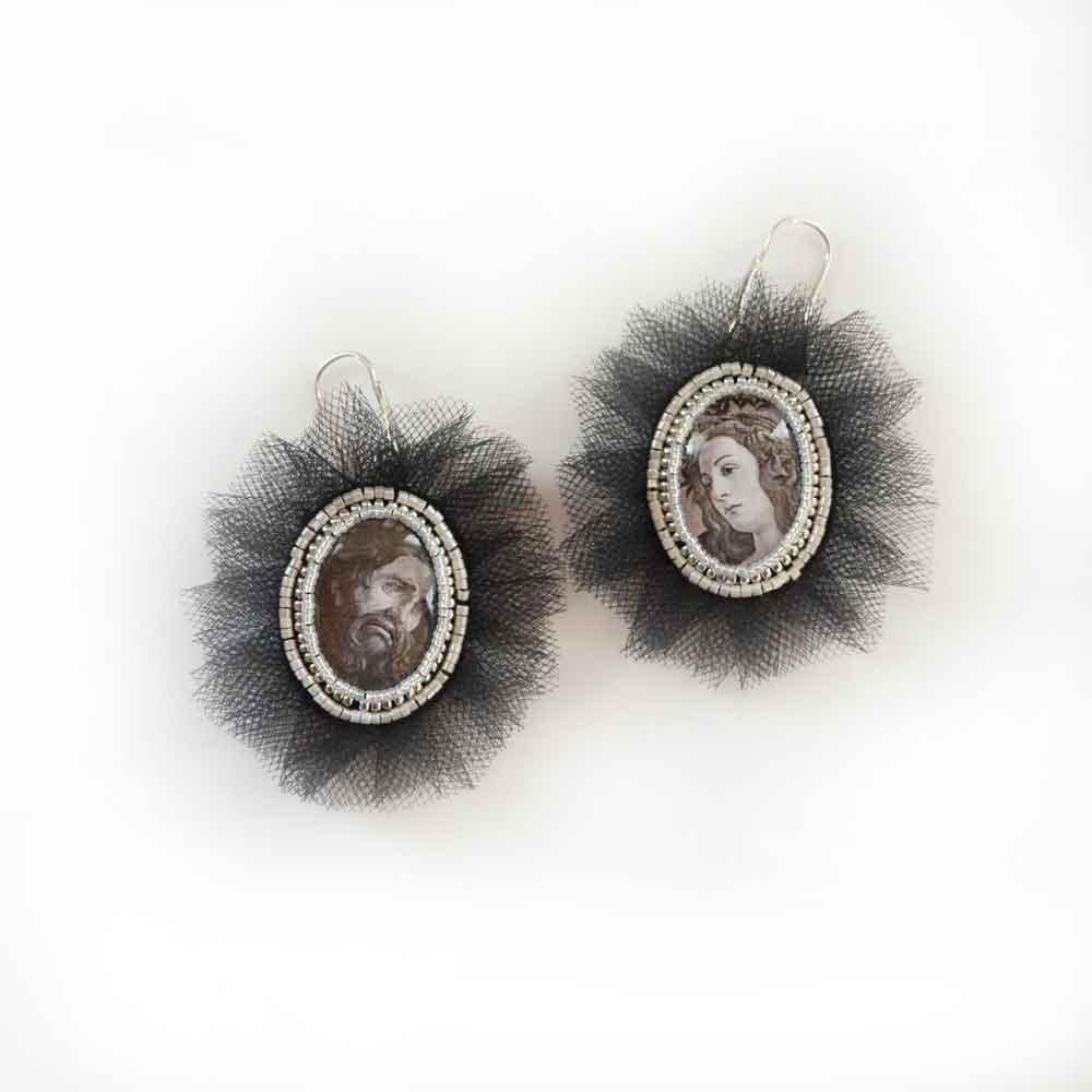 Orecchini con monachella aperta in argento 925 italiano placcato rodio con cammei in vetro, stampa su carta, ricamati con rocailles e delicas in vetro 11/0 e 15/0 e rifiniti con quattro strati di tulle nero mano seta. Il retro del pendente è rivestito in morbida ecopelle scamosciata. Dimensione pendente circa 6×5 cm. Garantiti senza nichel, cadmio e piombo secondo la normativa UE vigente. Interamente ricamati e cuciti in Italia.