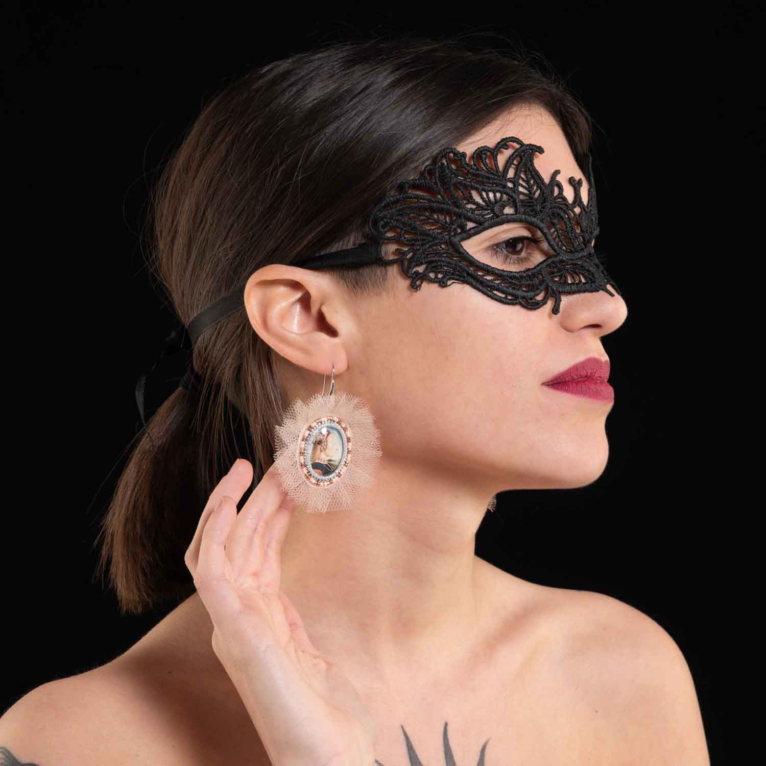 Orecchini con monachella aperta in argento 925 italiano placcato rodio con cammei in vetro, stampa su carta, rocailles e delicas in vetro 11/0 e 15/0, 4 strati di tulle rosa cipria. Il retro del pendente è rivestito in morbida ecopelle scamosciata. Dimensione pendente circa 6×5 cm. Garantiti senza nichel, cadmio e piombo.
