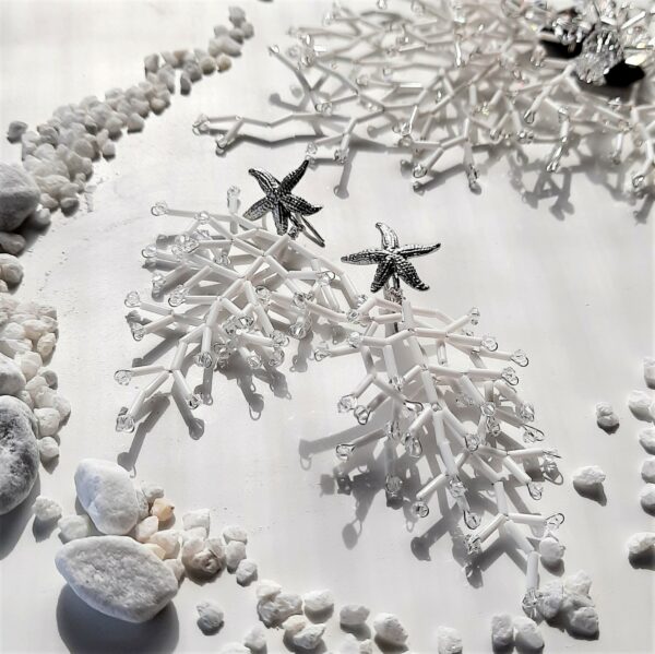 Orecchini monachelle aperte in argento 925 rodiato decorati con pendenti a forma di stella marina, realizzati con rametti di corallo in vetro bianco e cristalli Swarovski. Lunghezza orecchino circa 8 cm (monachella inclusa); diametro stella marina della monachella 2 cm.