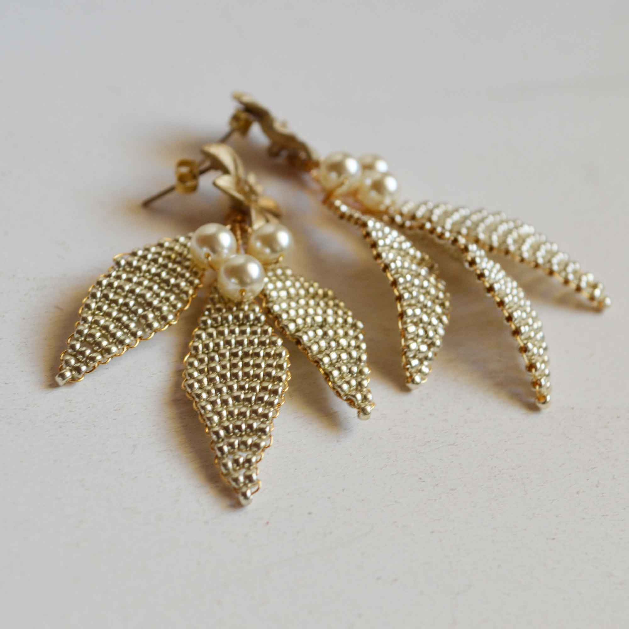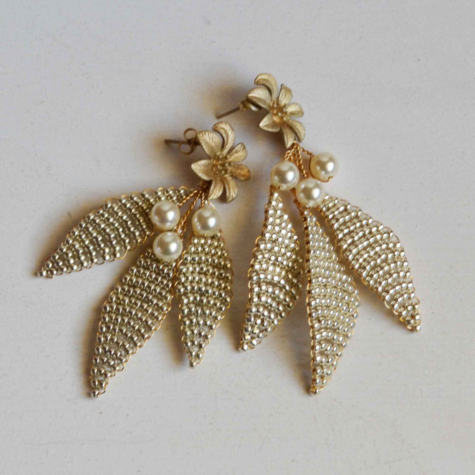 Orecchini a perno in bronzo dorato mat a forma di fiore, decorati con foglie di ulivo. Le foglie sono intrecciate con rocailles giapponesi 11/0 color alluminio e perle Swarovski da 6 mm. Lunghezza orecchino: 7,5 cm circa (perno incluso).