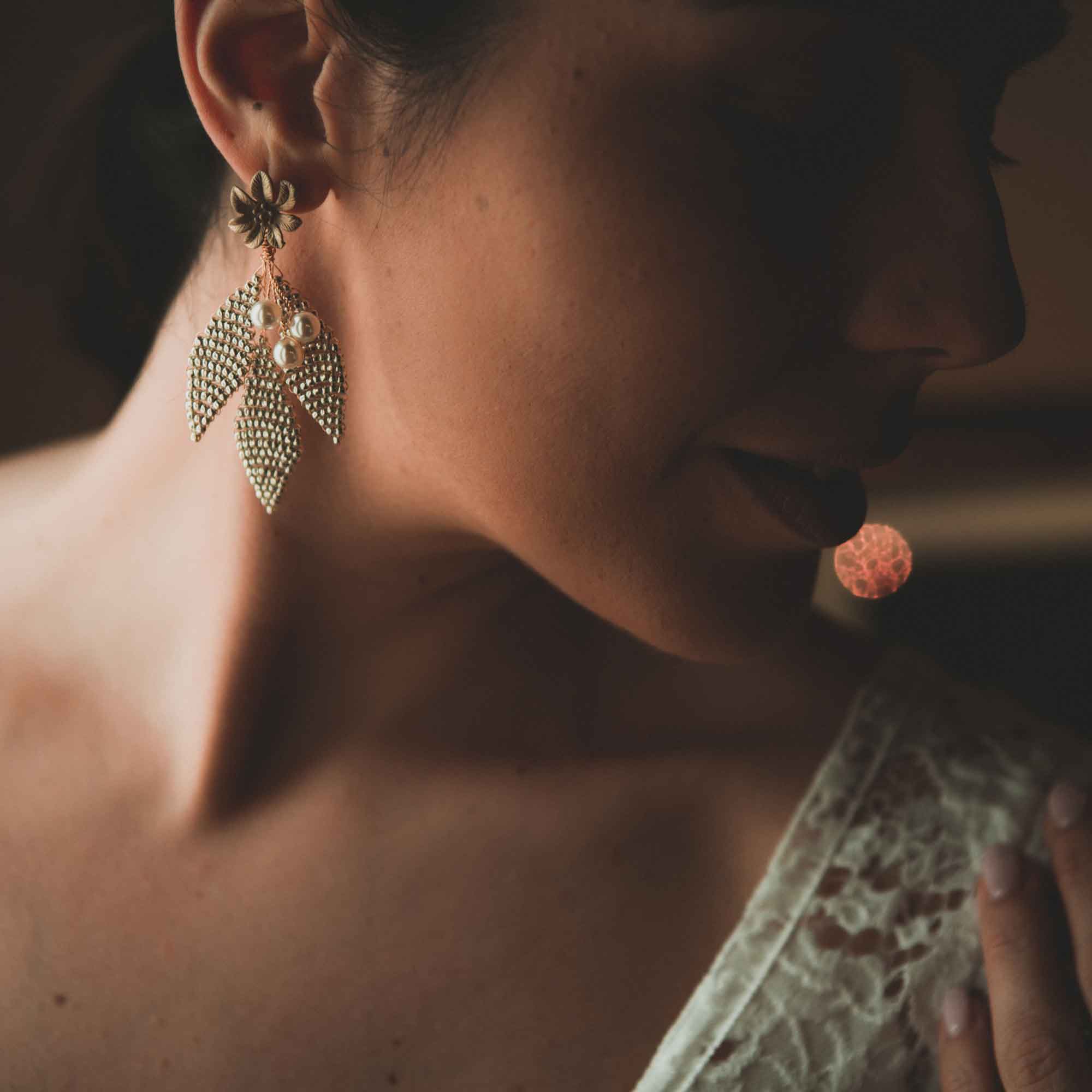 Orecchini delicati dal gusto rétro, perfetti per una cerimonia in stile bucolico. Lo stile vintage e il tema naturale rendono questi orecchini con foglie di ulivo particolarmente adatti ad abiti da sposa boho chic o dal sapore vintage. Per completare il tuo look puoi abbinarli alle forcine decorate foglie di ulivo della stessa collezione.
