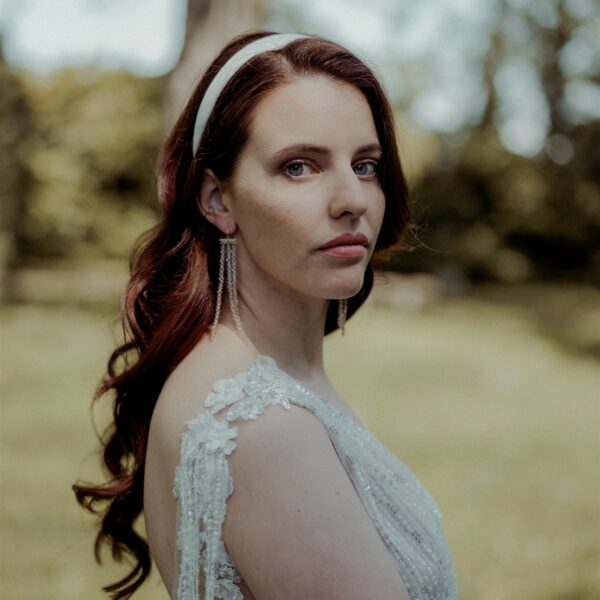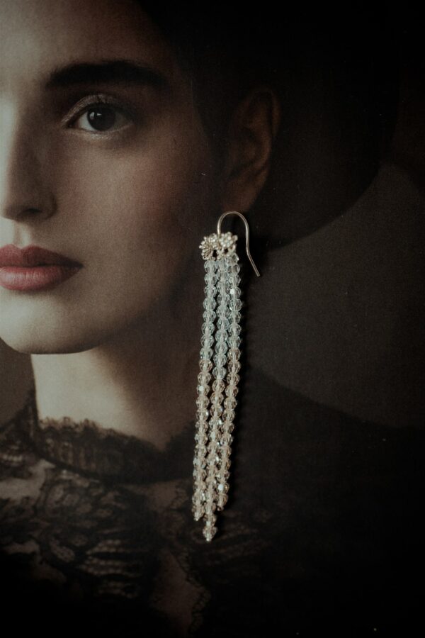 Orecchini lunghi con cristalli leggeri e scintillanti per un look estremamente glamour, adatti sia ad un look sposa che a un outfit elegante. Perfetti su un abito da sposa scivolato dal taglio sartoriale. Per completare il tuo look puoi abbinarli a diversi accessori per capelli, dal cerchietto piatto in duchesse satin al tralcio argento con cristalli Swarovski.