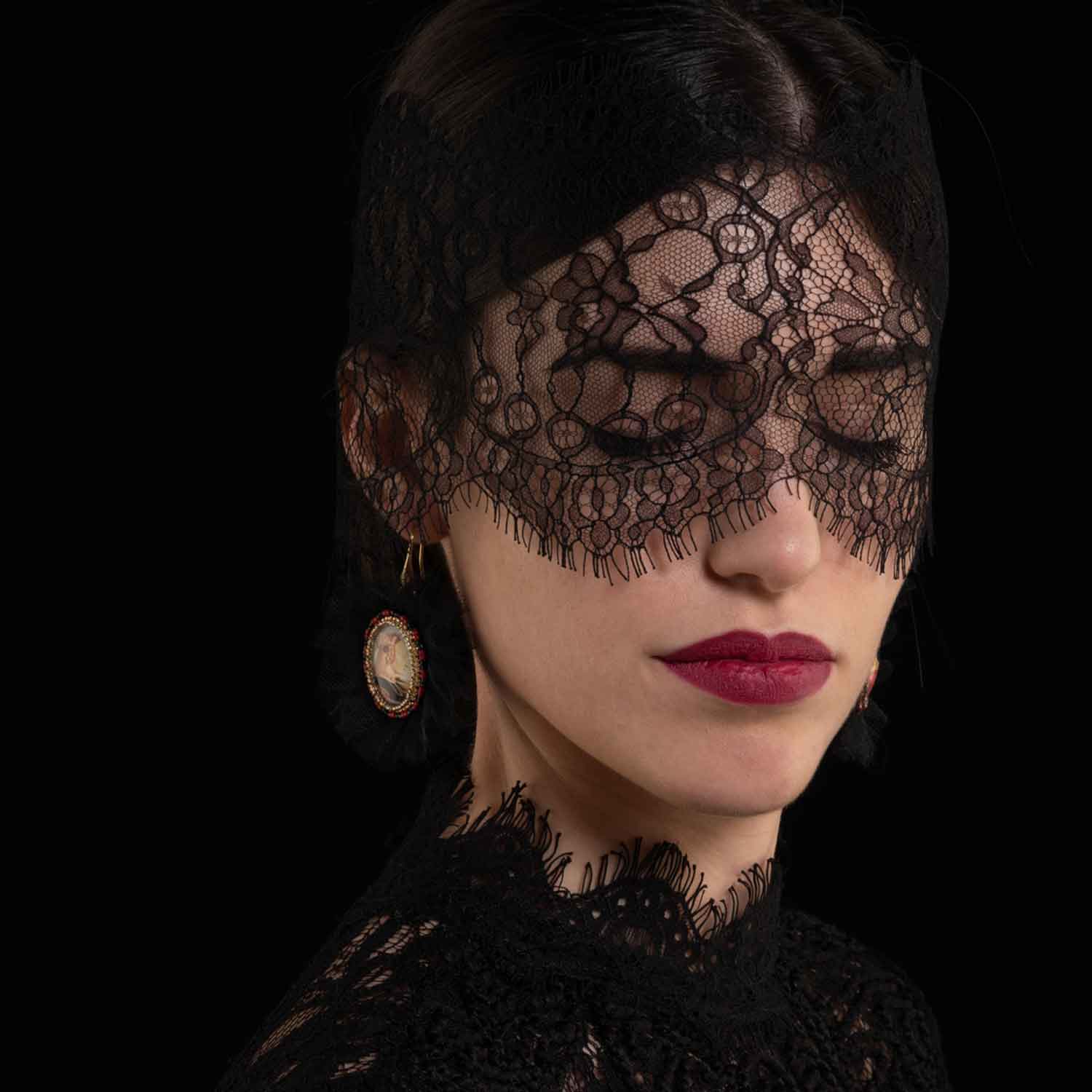Orecchini con monachella aperta in argento 925 italiano placcato oro 21kt con cammei in vetro, stampa su carta, ricamati con rocailles e delicas giapponesi in vetro 11/0 e 15/0. Ogni cammeo è decorato con una corona di quattro strati di morbido tulle nero mano seta. Il retro del pendente è rivestito in ecopelle scamosciata. Dimensione pendente circa 6×5 cm. Disponibili con altra tipologia di gancio — monachella chiusa, orecchini a perno — solo su richiesta.