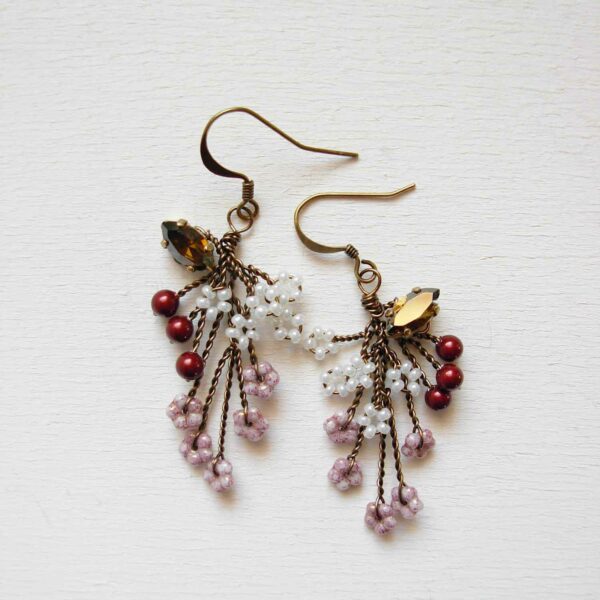 Orecchini pendenti dai colori autunnali con monachelle aperta in bronzo. Il pendente è intrecciato su filo di ottone anticato con perle Swarovski Bordeaux (rosso scuro), navette Swarovski Bronze Shadow (bronzo trasparente), fiori in vetro di Boemia rosa antico, rocailles bianco crema. Dimensione orecchino circa 6 x 2,5 cm (inclusa la monachella).