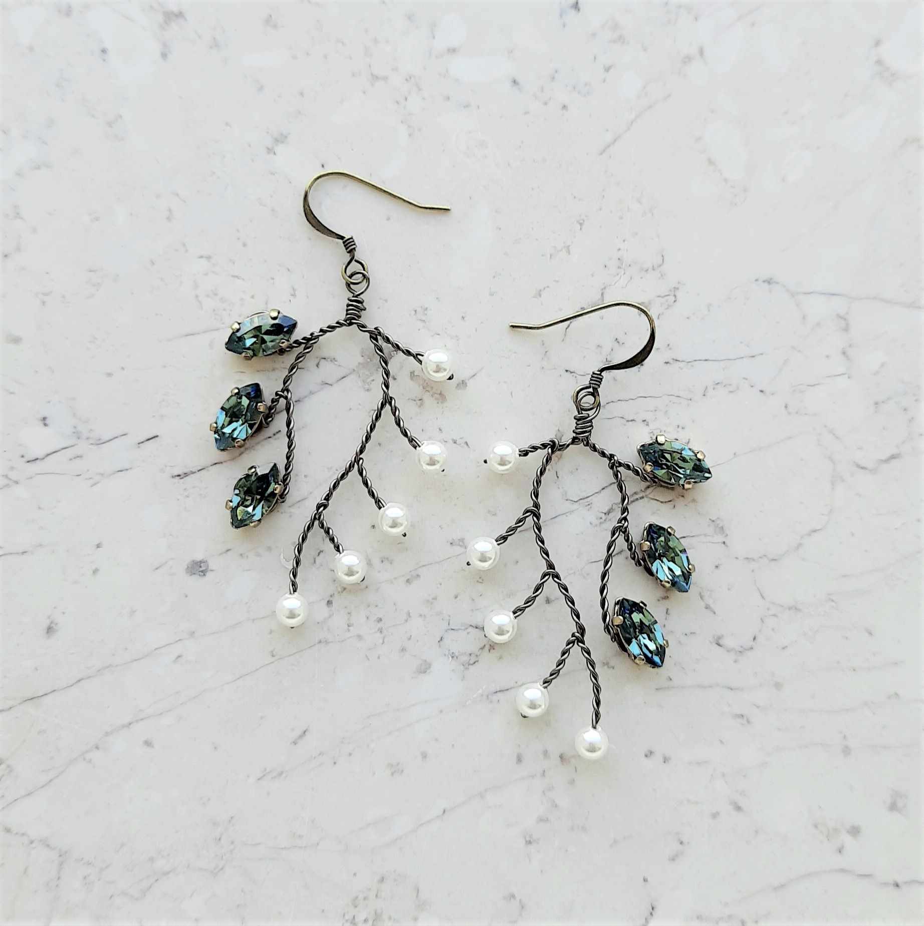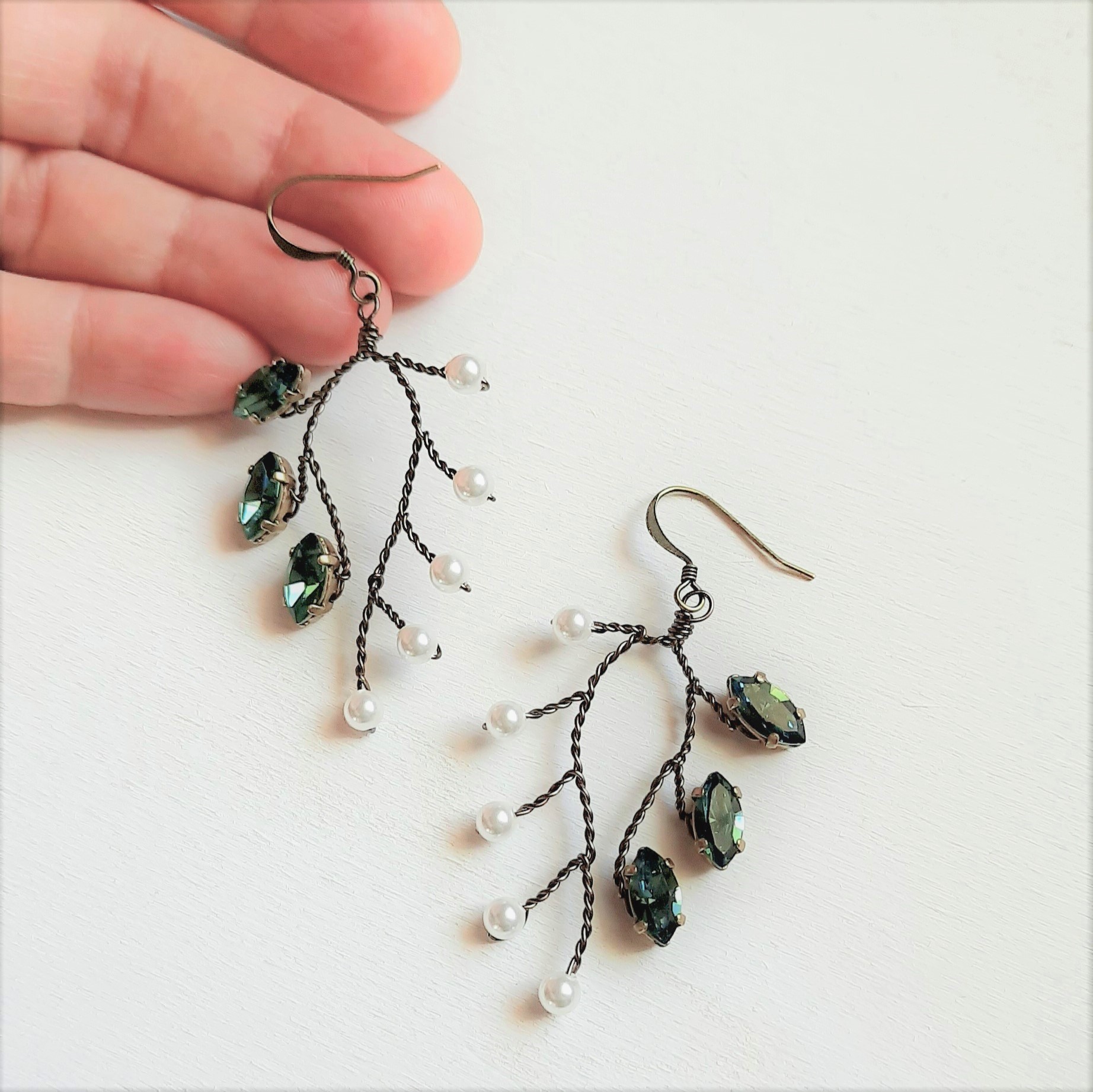 Orecchini a monachella aperta in bronzo e filo in ottone anticato con cristalli nei toni del verde e del bianco. Il pendente è decorato con perle Swarovski White e navette Swarovski Erinite. Il singolo orecchino è lungo circa 5,5 cm (monachella compresa). La struttura è morbida e mantiene la forma data.