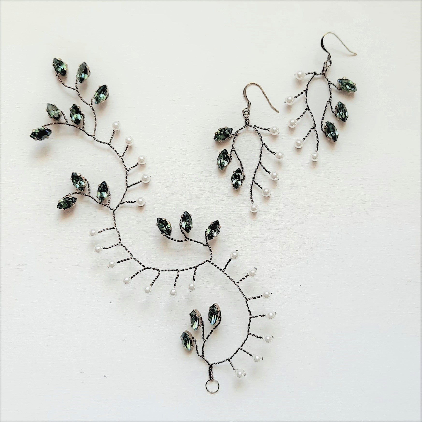 Questi orecchini con cristalli nei toni del verde e del bianco, delicati ma preziosi, staranno benissimo su un abito bianco romantico con ramage o motivi floreali, oppure in stile boho-chic. Perfetti con l’accessorio per capelli abbinato.