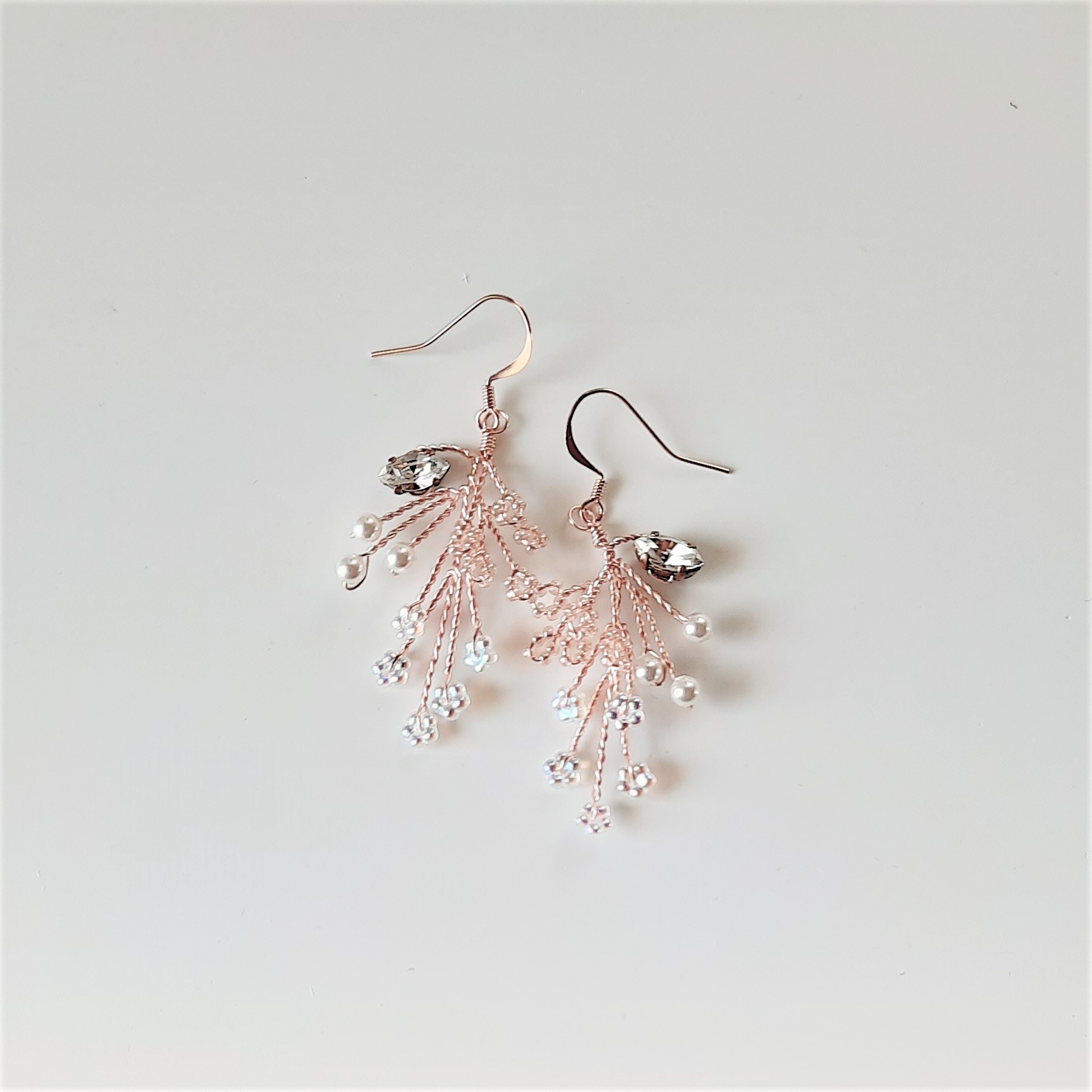 Delicati orecchini da sposa oro rosa dallo stile boho e romantico, adatti a un abito colorato a tono. Perfetti anche su un abito bianco in stile boho-chic. Abbinali alle forcine per capelli oro rosa della stessa collezione per completare il tuo look nuziale!