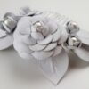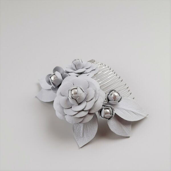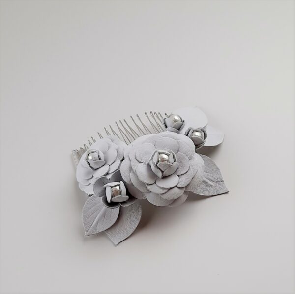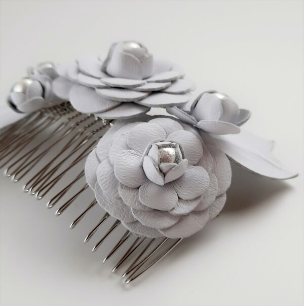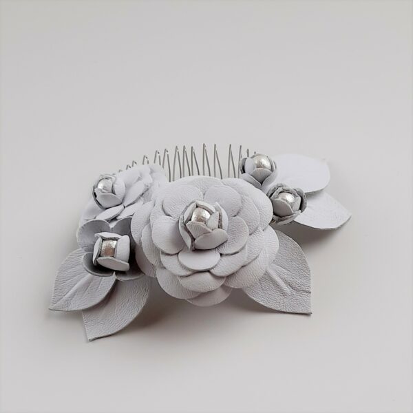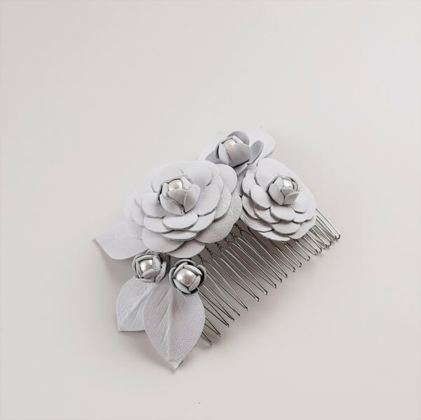 Pettinino o fermaglio per capelli da sposa con decorazione di camelie in pelle bianca e perle di cotone giapponesi. Dimensione pettine 8×4 cm; dimensione decorazione 12×7 cm circa. La pelle naturale è conciata al vegetale, di origine e lavorazione totalmente italiana. Ogni fiore è ritagliato e composto a mano e viene modellato secondo antiche tecniche di modisteria.
