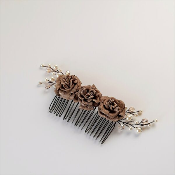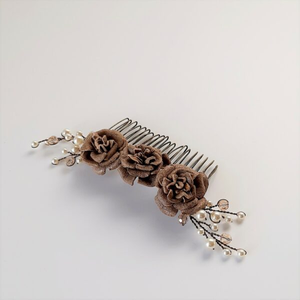 Originale e dal design essenziale, questo romantico pettinino da sposa con piccole rose bronzo è adatto ad una acconciatura raccolta e ad un look sposa decisamente sofisticato. Le sue linee essenziali e il colore vintage lo rendono adatto ad abiti boho chic o dallo stile rétro.