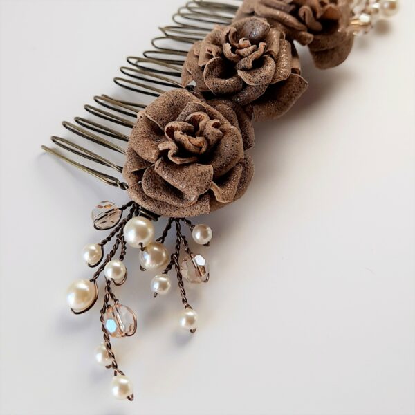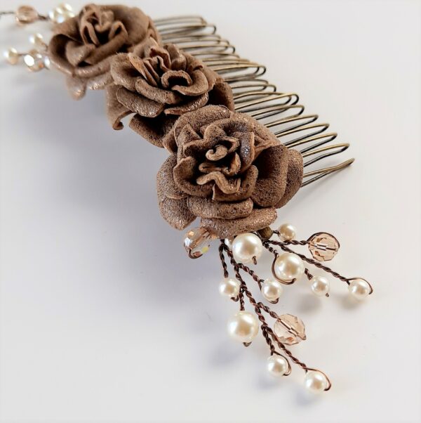 Pettinino o fermaglio per capelli da sposa con decorazione di tre piccole rose in pelle bronzo metallizzato, cristalli dorati e perle crema Swarovski. Dimensione pettine 8×3,5 cm; dimensione decorazione 14×3 cm circa. La pelle naturale è conciata al vegetale, di origine e lavorazione totalmente italiana. Ogni fiore è ritagliato e composto a mano e viene modellato secondo antiche tecniche di modisteria.