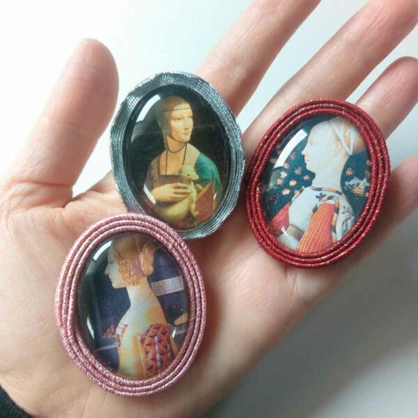 La collezione RINASCIMENTO de La Bottega Liventina si ispira ai ritratti femminili di epoca rinascimentale ad opera di grandi pittori italiani. Questa spilla è dedicata alla nobile Giovanna Tornabuoni, ritratta dal maestro Domenico Bigordi, detto il Ghirlandaio (1448-1494).