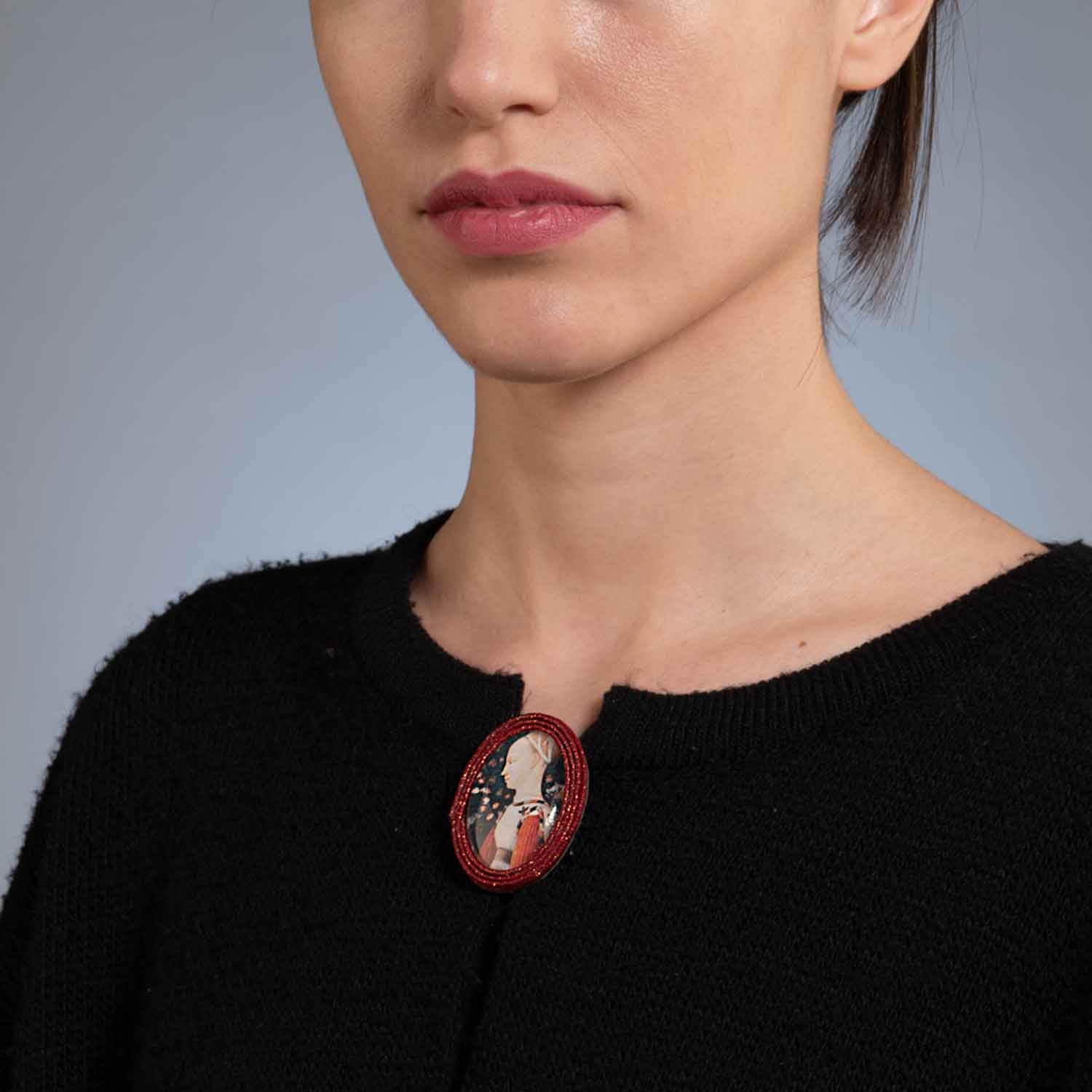 Spilla in metallo argentato con cammeo in vetro, stampa su carta e soutache rosso scuro con riflessi oro. Dimensione: 48×36 mm. Il retro della spilla è rivestito in morbida ecopelle scamosciata.