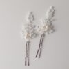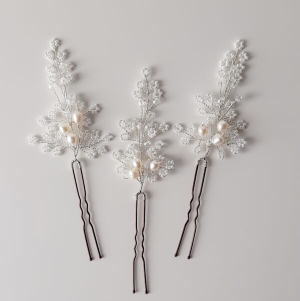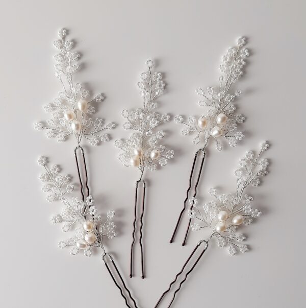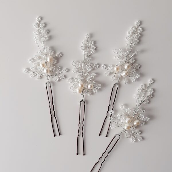Forcina o spilla da sposa per capelli argento con perle coltivate ovali bianche, cristalli Swarovski 4 mm Crystal (trasparenti) e perline in vetro bianche. Dimensione decorazione di una singola forcina circa 6×4 cm (forcina esclusa).