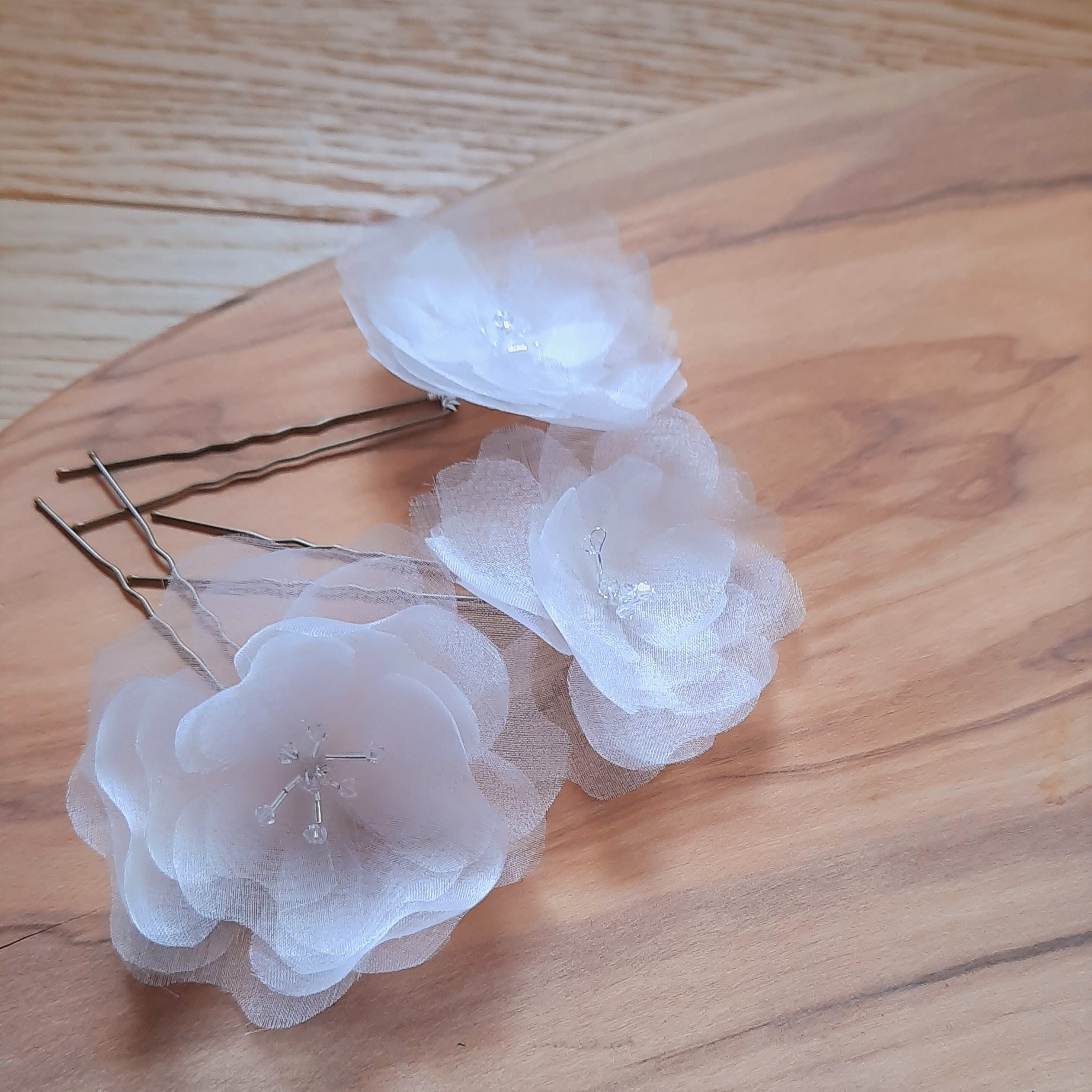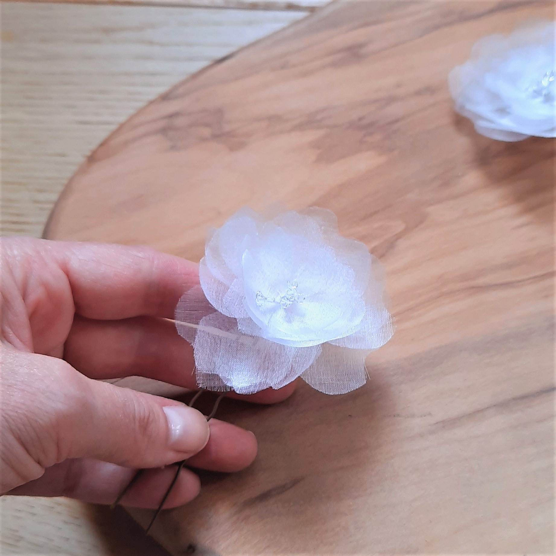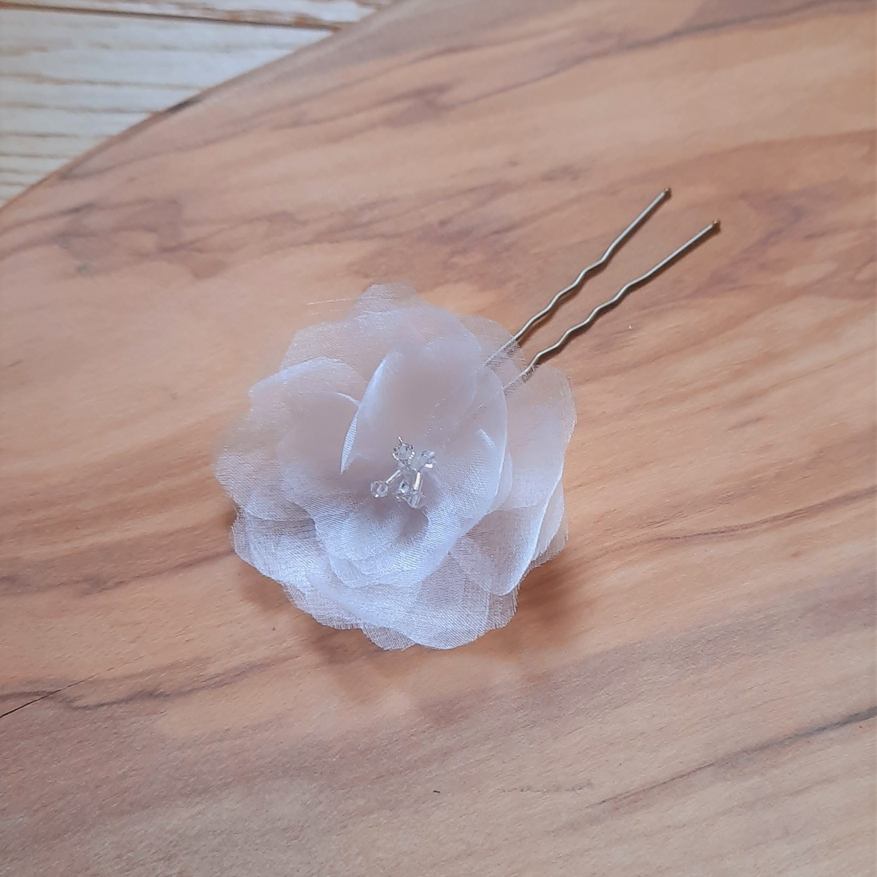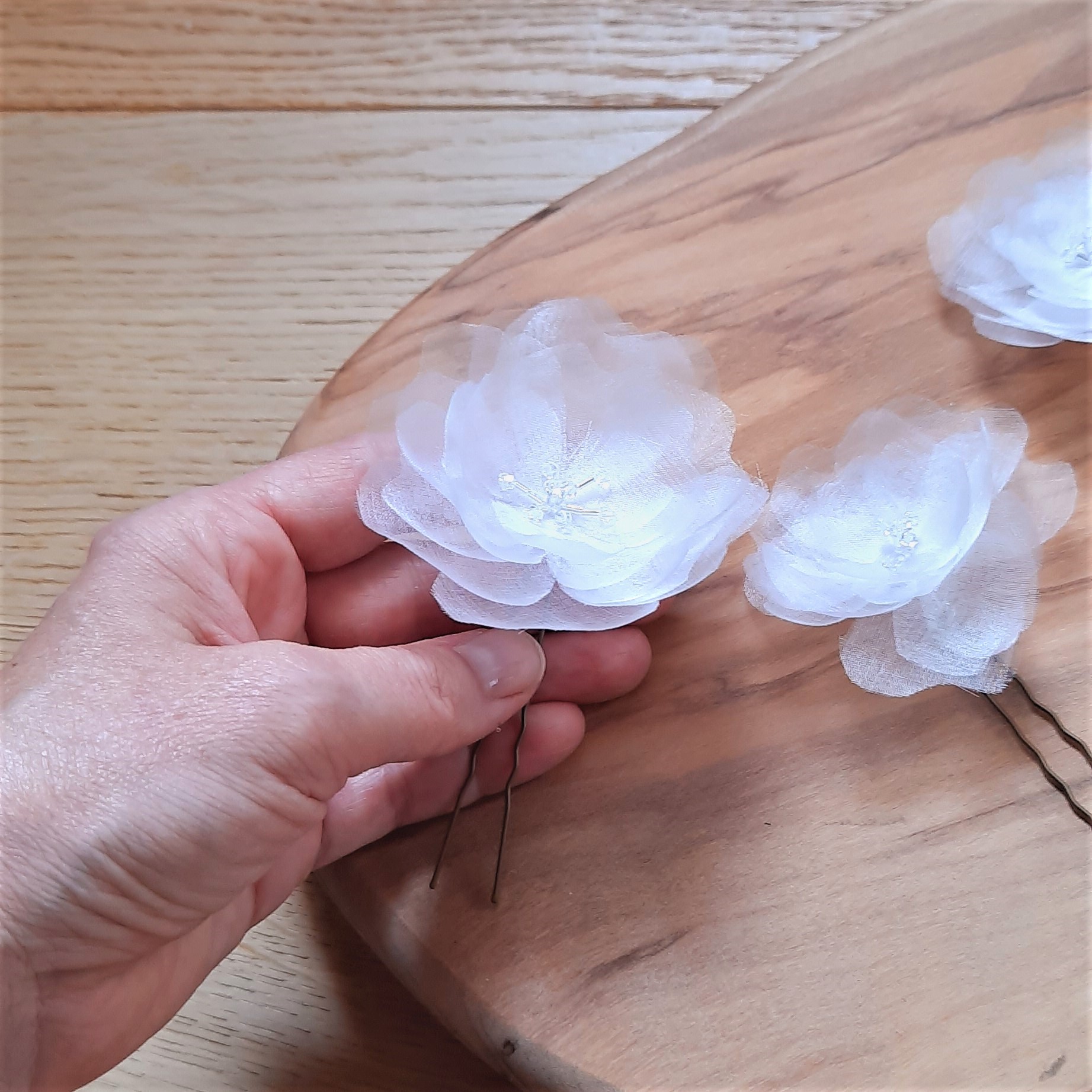 Spilla fiore di peonia in organza bianca di pura seta naturale. Il centro di ogni fiore è ricamato a mano con piccole bugles giapponesi e cristalli Swarovski. Si applica all’acconciatura grazie a una forcina (inclusa). Diametro circa 6-7 cm.