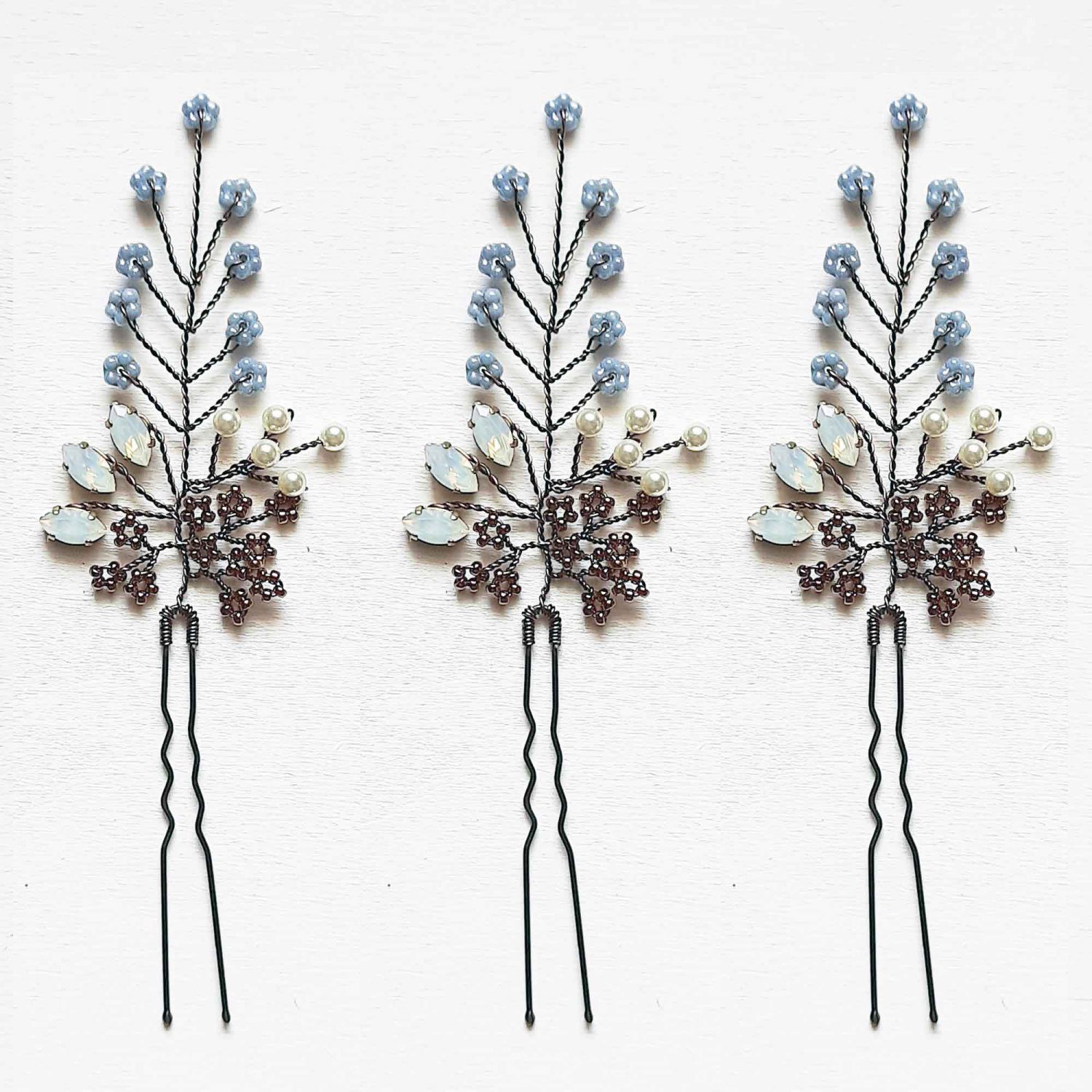 Forcina o spilla per capelli in filo di ottone anticato decorata con fiori in vetro “non ti scordar di me” blu polvere, rocailles giapponesi bronzo, perle Swarovski 4 mm Cream (crema) e foglie di cristalli Swarovski White Opal (bianco opalescente). Dimensione decorazione di una singola forcina circa 6×4 cm (forcina esclusa).