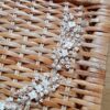 Accessorio per capelli nuziale a tralcio con fiori in madreperla bianchi, lunghezza 25 cm, ampiezza circa 3 cm. Modellabile a piacere. Sul filo in metallo argentato sono intrecciate perle Swarovski da 4 e 6 mm bianche, cristalli Swarovski Crystal da 3 e 4 mm, rocailles giapponesi bianco perlescente e piccoli fiori a quattro petali in madreperla bianco naturale. L’accessorio, modellabile a piacere, si fissa facilmente con forcine da parrucchiera (non incluse).