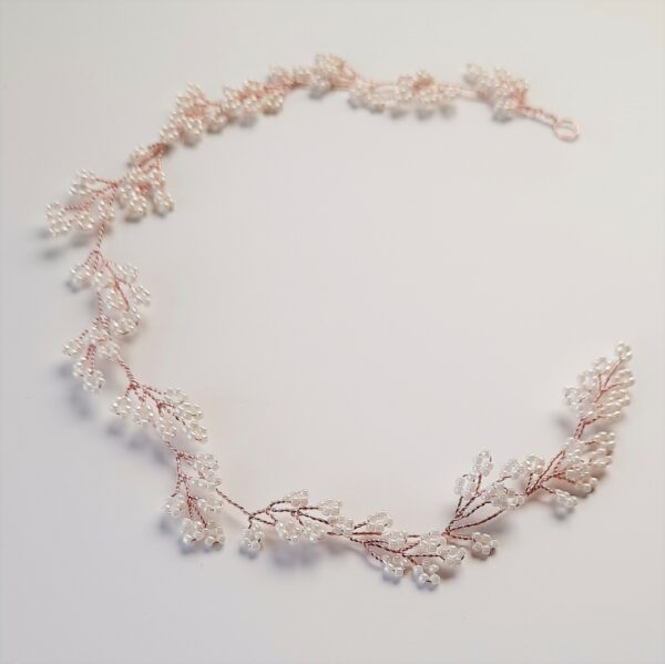 Delicato tralcio nuziale oro rosa con rametti di perline in vetro bianco crema.