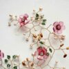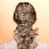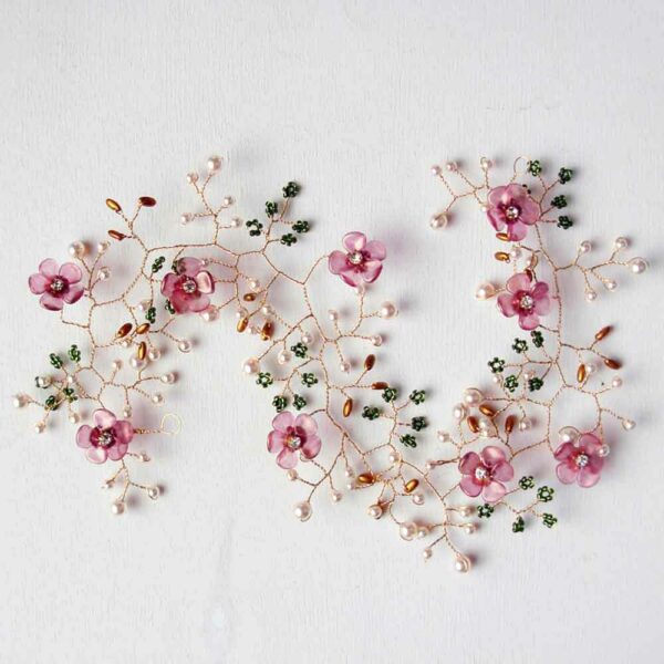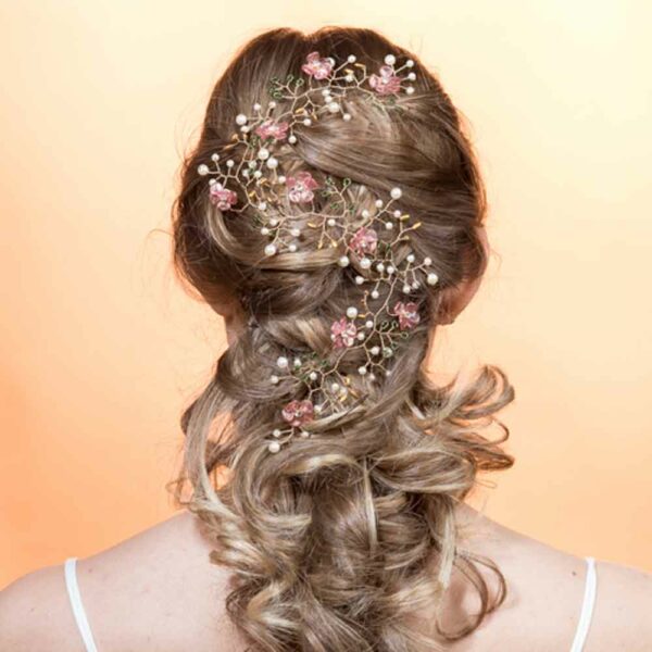 Accessorio per capelli a tralcio oro per la sposa con fiori in vetro ricamati rosa, lunghezza 45 cm, ampiezza circa 6 cm. Modellabile a piacere. Sul filo in metallo oro sono intrecciate perle Swarovski da 4 e 6 mm Creamrose (color rosa crema), rocailles giapponesi verdi Silver Lined (verdi con rivestimento interno argentato), perline bronzo e fiori in vetro rosa con strass centrale ricamati a mano e successivamente applicati alla composizione. Le piccole asole alle estremità del tralcio permettono di fissare l’accessorio con pratiche forcine da parrucchiera, rendendolo versatile e adatto a moltissime acconciature.