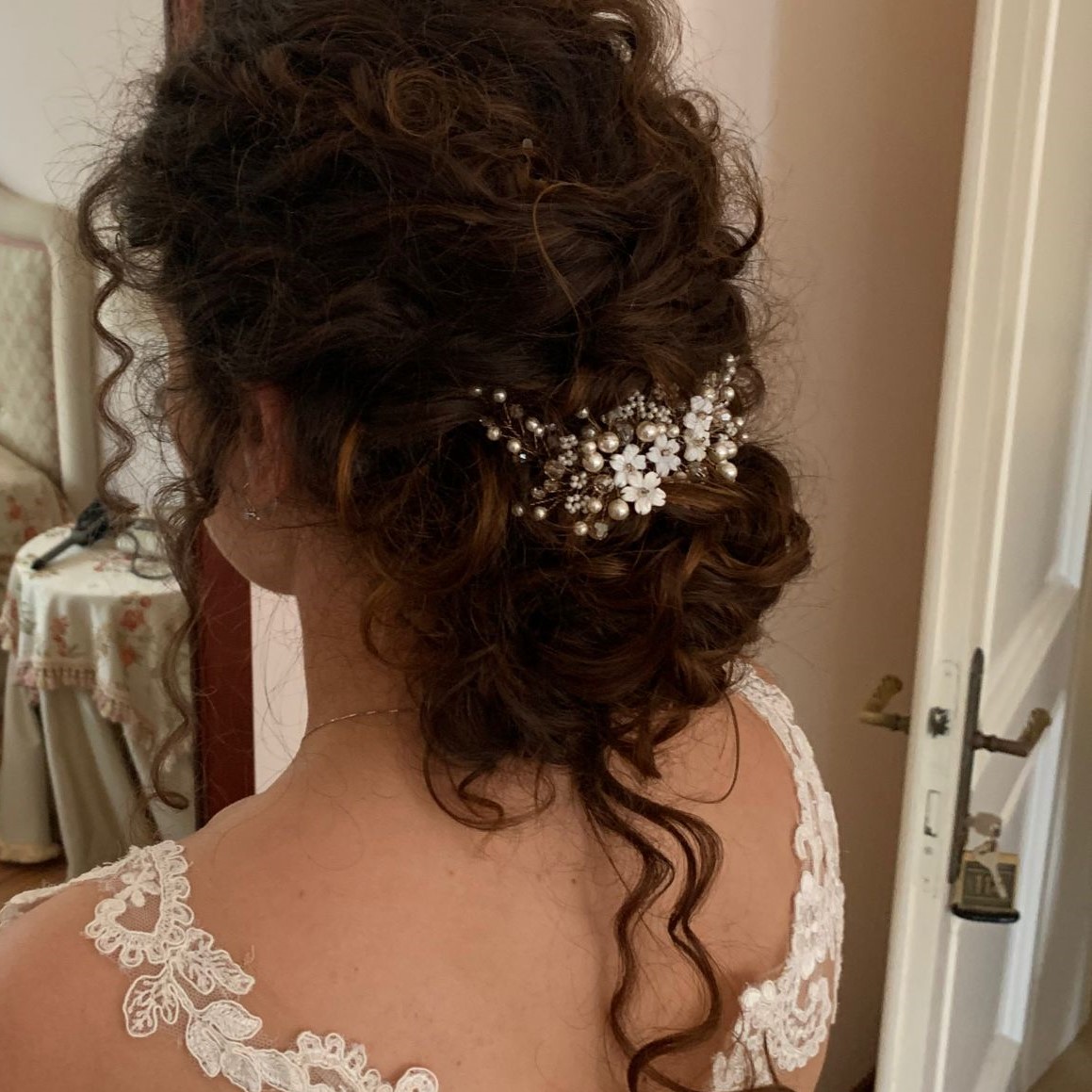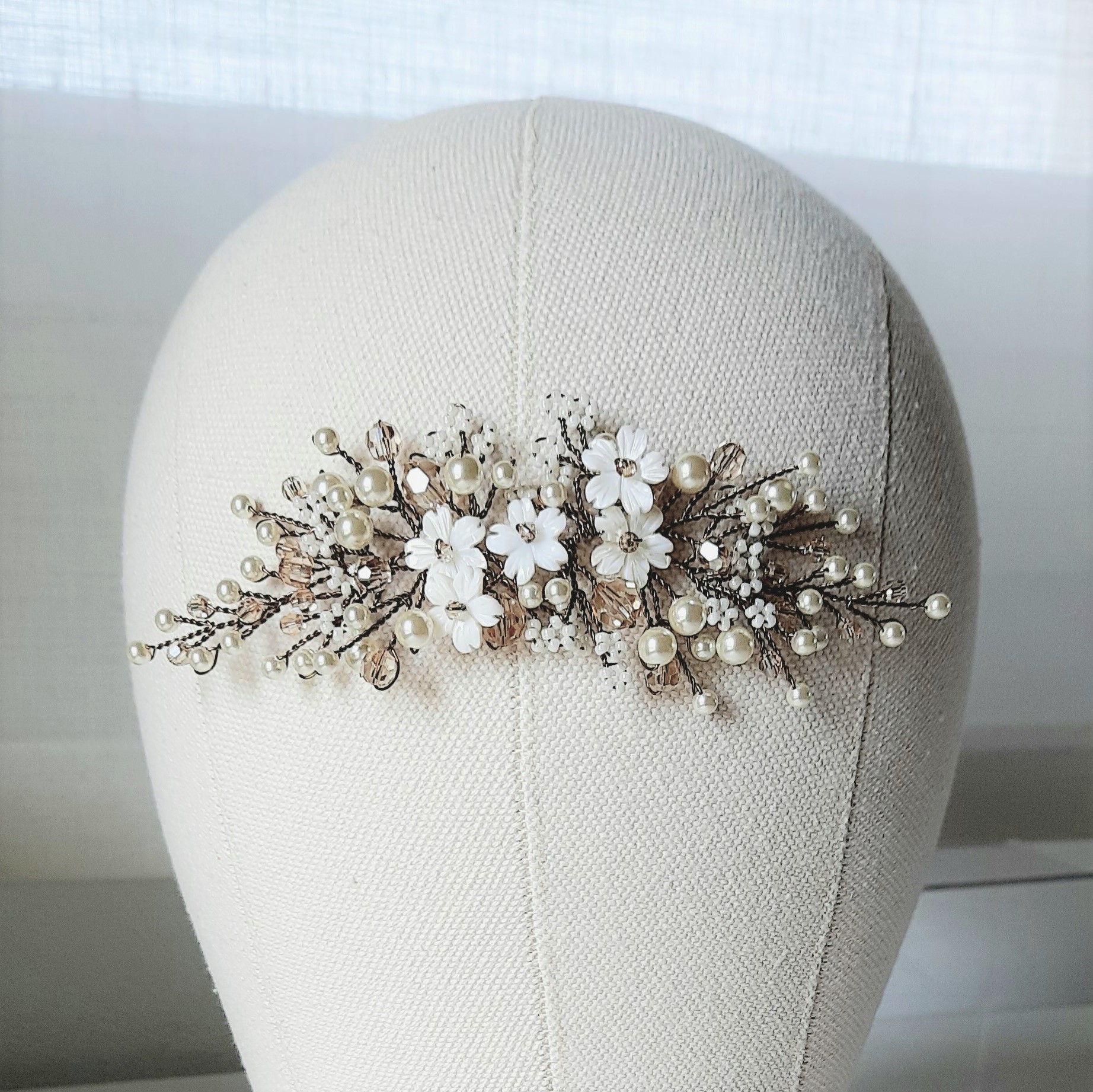 Questo tralcio da sposa con fiori in madreperla, opulento e dal look botanico, starà benissimo su un abito leggero e romantico, decorato con ramage o motivi floreali in stile boho-chic. Perfetto anche per impreziosire il velo. Si applica con forcine invisibili (non incluse).